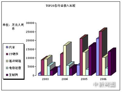 現(xiàn)在的情況是怎么樣呢?整個中國市場的網(wǎng)絡(luò)廣告投放額在增加,但以前那種一家獨(dú)大的情況不見了。更多的企業(yè)主體參與進(jìn)來了。從下面的網(wǎng)絡(luò)廣告TOP20各行業(yè)投入比較表中可以看到,在2006年,汽車已經(jīng)超越了互聯(lián)網(wǎng)企業(yè),成為對網(wǎng)絡(luò)廣告貢獻(xiàn)比例最大的行業(yè)之一,僅僅次于IT硬件產(chǎn)業(yè)。