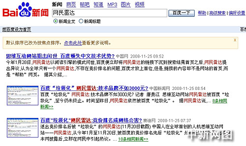 24日的新聞《思維互動網站狙擊問世 百度頓失中文技術優勢?》,分析了百度賴以稱霸市場、堅持競價排名策略的中文技術優勢或失的情況,網民雷達在文中表示,百度的中文技術優勢主要有兩個方面,一是對網頁的各類信息進行過濾,準確提取正文;二是符合中國人習慣的排序規則的建立。其中,第一個優勢最為明顯。而網民雷達是中國人完全獨創的中文智能處理系統,和百度一樣,都是建立在中文自動化智能處理技術上。在這個核心技術層面上,百度建立的是搜索引擎,而網民雷達則建立了人機思維互動網站,旨在提高網民閱讀效率和質量。這種技術,既可以與傳統門戶網站結合,粉碎百度多年來一直利用自動化處理技術向門戶網站進軍的企圖,又可以與任何一個搜索引擎結合,顛覆任何一個中文搜索引擎的中文技術根基。