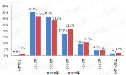 報(bào)告顯示,30歲以上年齡段人群占比攀升,整體占到網(wǎng)民的38.5%。這部分人群更為成熟,消費(fèi)能力較強(qiáng),是互聯(lián)網(wǎng)經(jīng)濟(jì)發(fā)展的重要用戶群。同時(shí),低齡網(wǎng)民占比也在上升,10歲以下網(wǎng)民群體增至1.1%,2009年,“校校通”工程實(shí)施接近尾聲,大部分初級(jí)學(xué)校都建立起較為完善的網(wǎng)絡(luò)教育課程。