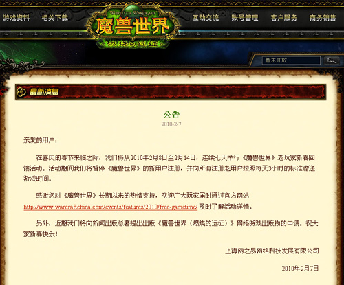 網(wǎng)易昨天是在一篇魔獸世界游戲內(nèi)活動(dòng)的公告中披露上述消息的。公告稱將從2010年2月8日至2月14日,連續(xù)七天舉行《魔獸世界》老玩家新春回饋活動(dòng)。活動(dòng)期間將暫停《魔獸世界》的新用戶注冊,并向所有注冊老用戶按照每天3小時(shí)的標(biāo)準(zhǔn)贈(zèng)送游戲時(shí)間。