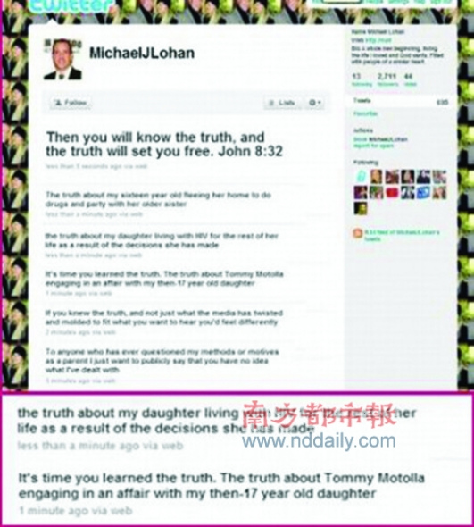 27日,林賽·羅韓的父親邁克爾·羅韓在Twitter稱女兒染上艾滋病,還說她17歲時曾與瑪莉亞·凱利的前夫Tom myMottola有染。邁克爾說,林賽現(xiàn)在的行徑如此荒唐,完全是因為得了艾滋病,因此她決定就這樣渾渾噩噩過一生!但很快邁克爾卻突然將消息撤下,聲稱自己的Twitter網頁被黑客入侵,網頁上所言都不是事實。事后有網友調查,發(fā)覺他的網頁沒有被入侵,證實他在說謊。