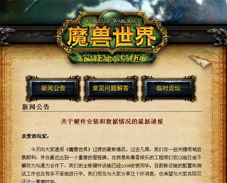 中新網6月24日電 今日,網易《魔獸世界》過渡網站發布最新通報,稱目前《魔獸世界》全新的硬件設施已經100%安裝完畢。