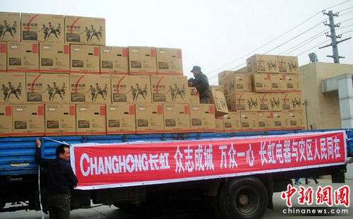 在青海廣播電視網(wǎng)絡(luò)中心的組織下,4月15日,長虹多媒體營銷公司西寧辦事處首批發(fā)出100臺電視;16日,發(fā)出405臺;17日,又追加500臺進入災(zāi)區(qū)。與此同時,長虹還采購了大量的方便面、面包、礦泉水等食品,與電視機一道進入災(zāi)區(qū)。