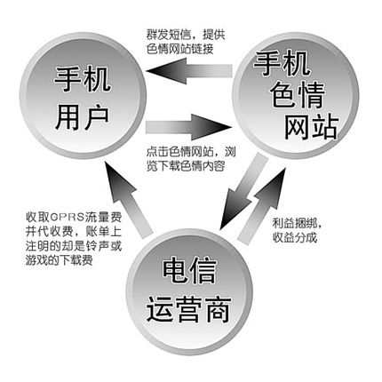 “簡單來說,一條手機(jī)色情信息內(nèi)容的發(fā)布,一般要經(jīng)過三個(gè)環(huán)節(jié):運(yùn)營商(主要是指各種手機(jī)圖片、鈴聲、視頻、文字、游戲等內(nèi)容發(fā)布平臺(tái)和渠道的提供者)、SP和WAP網(wǎng)站。”北京郵電大學(xué)一個(gè)曾長期關(guān)注移動(dòng)增值業(yè)務(wù)的人透露,“SP在運(yùn)營商和WAP網(wǎng)站間牽線搭橋,三者已形成捆綁各方的利益鏈,一旦獲利,三方都有收益!