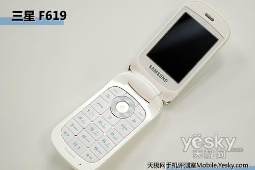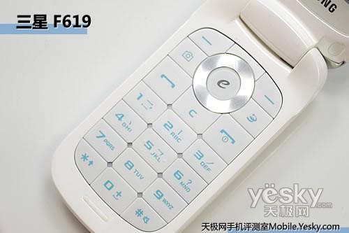 翻開三星F619的翻蓋,該機并沒有對手機內側進行太多的修飾,一樣是白色的主旋律,2.4英寸TFT屏幕位于上翻蓋,聽筒上加蓋了金屬防塵網,雖然聽筒孔徑有限,但通話聲音洪亮。一顆天翼的Logo標志著三星F619的定制地位。