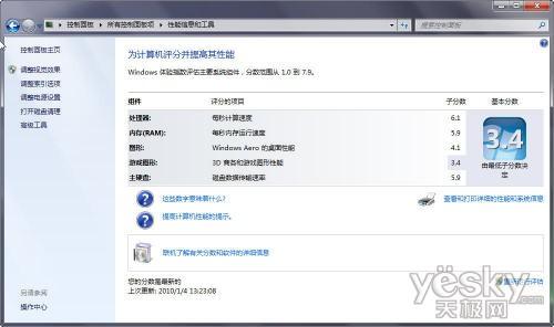 通過Win7檢測我們能夠很清晰看出Z55整體性能的表現(xiàn),其中處理性能最高,達(dá)到了6.1分,由于配備了4GB內(nèi)存配合64位操作系統(tǒng),內(nèi)存方面的性能也表現(xiàn)出色,達(dá)到了5.9分。另外硬盤部分也表現(xiàn)優(yōu)秀達(dá)到了5.9分。只是3D顯示部分稍顯不足僅為3.4分。不過對(duì)于商務(wù)用戶來說,3D部分在實(shí)際應(yīng)用中并不太多,況且配備9400M獨(dú)立顯卡能夠流暢運(yùn)行目前大部分主流游戲和商務(wù)3D軟件。