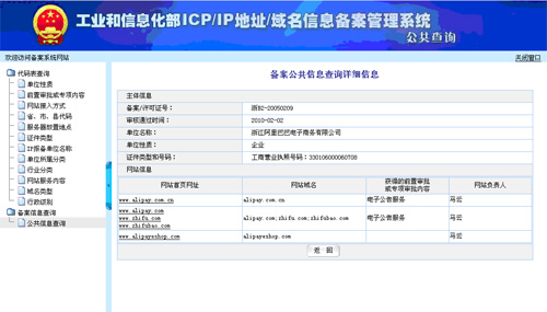 記者同時在工信部域名備案系統查詢發現,相關域名已經于2010年2月2日通過審核,申報單位為浙江阿里巴巴電子商務有限公司,且域名所匹配的ICP證號正是目前支付寶所使用的ICP證號。