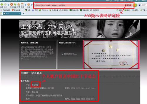 中新網(wǎng)4月24日電 360安全中心今日再度發(fā)出釣魚網(wǎng)站安全警示:近期不法分子以玉樹賑災(zāi)捐款的名義制作了大量釣魚網(wǎng)站,利用網(wǎng)友愛心大肆詐騙。360安全專家石曉虹博士為此提醒廣大網(wǎng)民,在網(wǎng)上用網(wǎng)銀、第三方支付工具等在線方式捐款一定要慎重,并盡量使用360網(wǎng)盾等有效的反釣魚軟件進(jìn)行自動識別各種釣魚網(wǎng)站。
