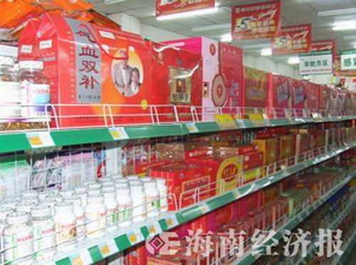 昨日下午,記者在海口街頭走訪,發現幾乎所有藥店都經營保健食品。在瓊山區府城鎮建國路瓊山人民醫院附近的一些藥店,保健食品甚至占去大半柜臺。海秀路西一家規模較大的藥店干脆“變身”成了雜貨鋪,洗衣粉、沐浴液、化妝品一應俱全。按藥店老板的話說,現在滿街是藥店,朝超市化方向發展,也是在培育新的利潤增長點。
