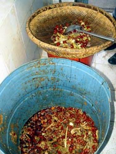 昨日下午,記者以顧客的身份來到該火鍋店,無意中在洗刷間看到,里面排放著2只一大一小臟兮兮的潲水桶。記者走近一看,發現大桶里有很多剩菜,包括暗紅的辣椒、蔬菜、鴨血、餐巾紙、煙頭、筷子等各種雜物。旁邊的一個小桶上擱著一個竹筐和一把勺,筐中已經盛了許多辣椒和大蒜等剩菜。記者詢問一名進來端盤子的服務員,撈起這些剩菜做什么用途時,對方稱老板規定,客人吃剩的菜不能隨便倒,還可以用。但該服務員很快就意識到說漏了嘴,立即問記者進洗刷間做什么。記者再問,對方三緘其口。