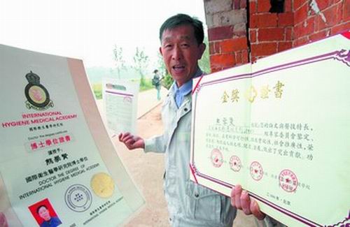 熊學賢從一個箱子內(nèi)抱出一疊厚厚的證書:中華科技咨詢專家、全國首屆十大高級民間傳統(tǒng)療法師金獎、中華人民共和國杰出人才、世界名人學術博覽會發(fā)明專利金獎、英國醫(yī)學院自然醫(yī)學及天然藥物研究中心客座課題教授、日內(nèi)瓦發(fā)明家公會會員……據(jù)了解,這些榮譽稱號是由世界民間傳統(tǒng)療法師聯(lián)誼會、北京炎黃經(jīng)絡研究中心、香港國際醫(yī)學科學研究院、國際衛(wèi)生醫(yī)學研究院等組織頒發(fā)給他的。