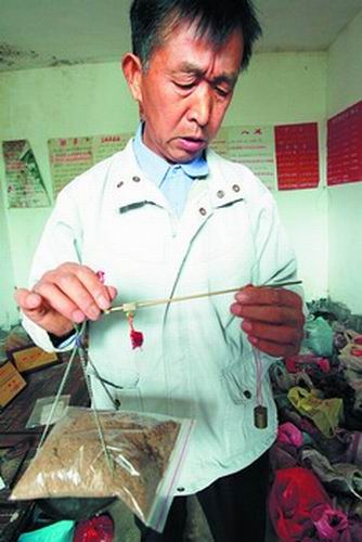 推開二樓的一間屋子,一股霉味撲鼻而來,地上擺放著數(shù)百個裝有各類中草藥材的塑料袋和壇壇罐罐。“這些藥材中99%是植物類藥品,也有少數(shù)動物類和礦物類藥材,有些是我從邵東等地采購來的,有些是我上山采來的。”熊學賢拿出幾包已包裝好的粉末狀藥品告訴記者,這些是他研究出來的藥品,分別命名為“惡性腫瘤1號內(nèi)服藥”、“惡性腫瘤2號外敷藥”、“艾滋病攻克劑”等。記者看到,這些藥品的外包裝上無任何部門的批文,僅有一張打印的“說明書”。熊學賢說,他的這些藥品很有效果,已治好了多位患艾滋病和癌癥的病人。