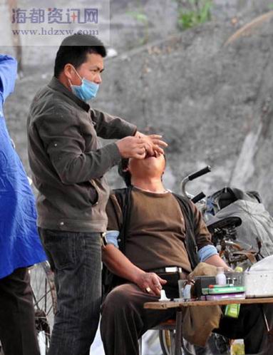 在其中一個攤位上,一名老人從口內(nèi)脫出整副假牙,游醫(yī)接過后放在桌子上,拿出一個小酒盞,倒入粉末與水?dāng)嚭停然旌衔锬毯蟮谷爰傺姥来驳娜毕萏帲謴乃芰洗锾统?顆假牙塞上,全過程均沒戴手套。此操作前后不到10分鐘,收費(fèi)50元。