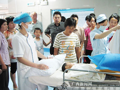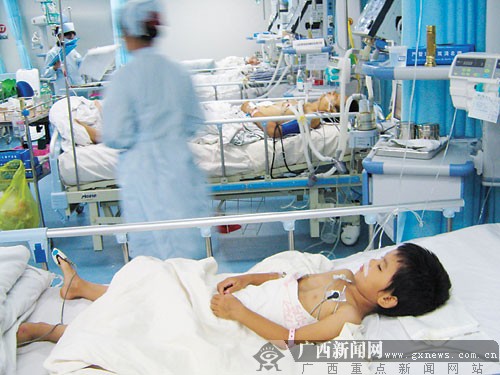 6月23日下午2時,記者趕到貴港市人民醫院時,正遇見自治區衛生廳、教育廳的領導前來看望中毒的幼兒。在醫院外科樓二樓的重癥監護室內,5名幼兒正在接受救治,其中3名病情較重。一名看起來只有四五歲的小孩口鼻插著導管,躺在床上不停地抽搐。醫生告訴記者,這名幼兒身體素質較差,被送到醫院搶救后出現了血尿、高燒、肺水腫等癥狀,有病情加重的趨勢。后來,經過搶救,病情得到緩解。