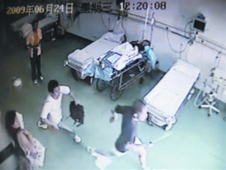 監(jiān)控錄像中顯示:一名光頭男子逃進(jìn)搶救室,兩名男子持刀一路追砍(見(jiàn)圖),在搶救室一角將其砍成血人才罷休。行兇幾分鐘后,6名砍人兇徒從容走出醫(yī)院,沿香江花園路口向三眼橋方向逃走。傷者隨即被送進(jìn)十一醫(yī)院手術(shù)室,搶救后一人傷勢(shì)嚴(yán)重被轉(zhuǎn)往協(xié)和醫(yī)院治療。