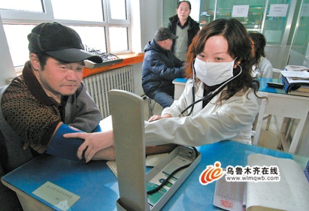 2月2日,在“烏魯木齊永紅 孝感”社區醫療衛生服務站,醫生正為永紅社區居民測量血壓。社區醫療衛生服務站的建立,方便了社區居民就診。