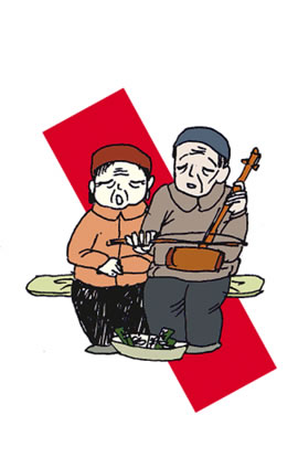 ☆吉利話扭倒費 身強體健的中年壯漢也有自己的乞討之道:在開門營業的攤點前耍獅子、打快板、送財神,不給錢就不走人,磨到你給錢為止。