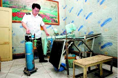 經查,該門診部內仍存放有大量藥品,一個小房間內放著兩臺婦科檢查床,還有氧氣瓶和吸宮器等物,沒有任何消毒措施,緊鄰的則是一個簡陋病房,里面有4張病床。就是這個臟亂的黑診所,門牌居然醒目地標著“婦產”、“人流”、“引產”等字樣。