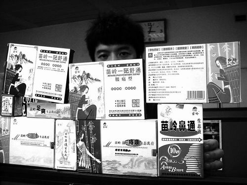 “我有鼻炎,常常鼻塞,有沒有什么好藥?”記者問!氨侨俊睜I業員從柜臺里面又取出一盒藥說,“你用苗嶺鼻通生態液吧,也是全中藥,效果特別好!