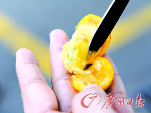 記者根據龔先生的引導,在石溪南約東街附近懷疑有問題的水果檔花2.5元買了25個金橘,一個一個剝開來后,發現總共15個里頭是有蛆的。蛆蟲呈米色,只有不到1厘米長,大都藏在果肉里頭,打開果皮后還能看到它在蠕動。有蛆的金橘摸上去都很軟,里頭的果肉組織往往被蟲蛀成一條條小通道。這種蛆金橘個頭比較小,有別于之前報道的曾發現蛆蟲的那種大柑橘。