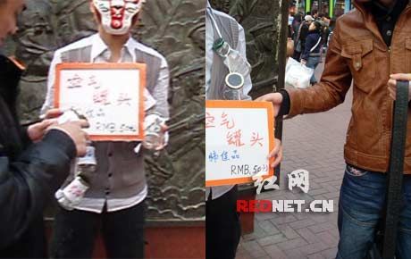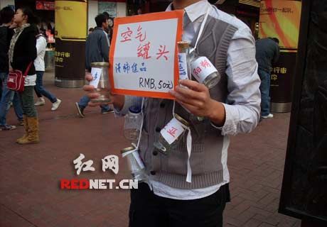 “發(fā)寶氣的吧?太扯淡了,竟然叫賣空氣!”23日傍晚,網(wǎng)友“閃賞”在紅網(wǎng)論壇發(fā)帖爆料,稱自己當天下午在長沙黃興路步行街逛街,在黃興銅像旁看到一男子臉上戴著面具,全身掛滿了寫著陽朔、三亞、可可西里、九寨溝字樣的玻璃瓶,手舉“空氣罐頭,50元”的紙牌,引來不少人圍觀。男子自稱空氣是從全國各地方收集來的,屬他勞動成果,所以他有理由出售而贏利。