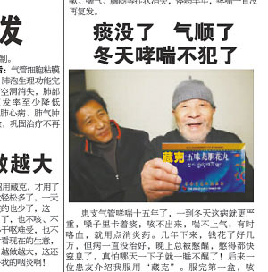 “患友介紹我服用了‘藏克’。服完第一盒,咳嗽、胸悶就緩解多了。”昨天,看著我市某報上的一則藥品廣告,90歲高齡的老人張治欽感到納悶,“我從來沒得過這病,卻上了該藥的宣傳廣告!