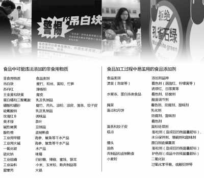 吊白塊、蘇丹紅、美術(shù)綠、罌粟殼……這些讓老百姓提心吊膽又深惡痛絕的東西,都上了衛(wèi)生部等部門(mén)12月15日公布的首批違法食品添加劑“黑名單”。(見(jiàn)上圖)