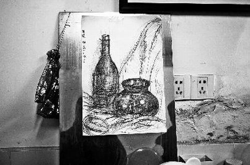 屋里的一面沙發(fā)上,還有十多張筱筱畫的素描,其中一張素描《瓶子和橙子》擺放在客廳。這張畫上的字跡與她寫給母親的遺言條字跡如出一轍。