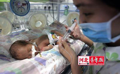 昨日,記者在醫(yī)院的新生兒監(jiān)護病房看到,三個小男孩兒都躺在保溫箱里。據(jù)兒科醫(yī)生介紹,三個孩子都是低體重早產(chǎn)兒,出生時孕周為33周多。老大是1.58公斤,老二和老三是1.55公斤,自3月16日出生到現(xiàn)在已經(jīng)度過了呼吸關,還有感染關、喂養(yǎng)關、黃疸關在等待著他們。這兩天護士已經(jīng)開始通過鼻飼管注射給他們喂奶了,三個孩子每次分別給注射7毫升、3毫升和4毫升,2個小時喂一次。從目前來看,除老大有點貧血外,三個孩子心肺功能腦部發(fā)育都很好,預計還有2到3周孩子們才能出保溫箱。