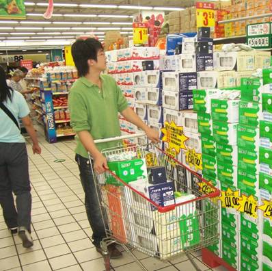 隨著京城確診兩例甲型H1N1流感,在馬連道的家樂福超市,記者看到牛奶產(chǎn)品區(qū)出現(xiàn)了購買熱潮。不少消費者的購物車中,都放著一兩箱牛奶,而促銷人員除了要忙著導(dǎo)購,還要不斷進(jìn)行補(bǔ)貨。