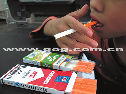 據(jù)家住安順市中華東路的劉女士講,他的兒子今年8歲,讀小學(xué)二年級(jí)。昨日上午,她看到兒子與三個(gè)小朋友在院子里玩時(shí),突然發(fā)現(xiàn)他們每人手里都夾了一支香煙,不停地送到嘴里。劉女士見(jiàn)了,氣得幾步走到兒子的身旁,正要伸手教訓(xùn)兒子時(shí),才發(fā)現(xiàn)這不是香煙,而是仿照香煙形狀的酸酸糖。兒子告訴劉女士,這些糖是他在附近的一個(gè)小攤子上用5角錢(qián)一包買(mǎi)來(lái)的,兒子還說(shuō),這種糖在他們學(xué)校附近也有賣(mài),因?yàn)橄裣銦煟蠹叶加X(jué)得好玩,好多男同學(xué)都在買(mǎi),而且有的同學(xué)買(mǎi)來(lái)后,就像大人給別人敬煙一樣“敬”給關(guān)系好的同學(xué)“抽”。