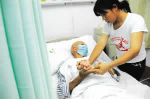 昨日(26),西南醫(yī)院,女兒正為父親擦手 記者 張路橋 實(shí)習(xí)生 胡健 攝
