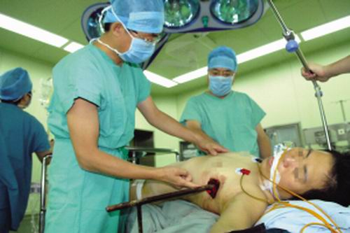 來到醫(yī)院后王女士已經(jīng)出現(xiàn)意識模糊,同時(shí)伴有劇烈的胸痛。胸外科主任張臨友教授和副主任徐廣全教授迅速組織相關(guān)科室人員會診,爭取快速摸清患者胸腔內(nèi)的情況和鋼筋對各器官造成的損傷。由于消防隊(duì)員在切割鋼筋時(shí)怕傷到王女士,所以切割點(diǎn)離傷口較遠(yuǎn),造成留在體外的鋼筋較長,傷者無法進(jìn)入CT拍攝影像,給診斷帶來了很大的困難。醫(yī)生只得為王女士進(jìn)行了胸部的X光片檢查。依靠豐富的臨床經(jīng)驗(yàn)和X光片,醫(yī)生判斷王女士的肺組織已經(jīng)損傷,必須立即開胸探查。