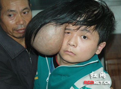 這名不幸的“雙頭”少年名叫梁樂,來自湖南耒陽。梁樂的父親梁某介紹,這個病兒子已經(jīng)患了10多年之久。“兒子小的時候頭很大,醫(yī)生檢查為腦積水,后來在衡陽一所醫(yī)院開了刀。”梁某說,過了一兩年兒子頭上突然長了個雞蛋大的“瘤子”,之后,隨著年歲增長,“瘤子”越來越大,到現(xiàn)在都長得有一個頭那么大了。由于兩個“頭”負擔太重,梁樂連站都站不穩(wěn),必須要父母親背著,每天晚上睡覺也只能仰著睡。
