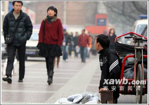 “襪子10塊錢4雙,大家來看看。”昨日(12月18日)下午3時許,在東大街上,尋常的叫賣聲中,一個小販坐在小木凳上,身著破舊的運(yùn)動服,面前是一個小地?cái)偅胖魃鳂拥男乱m子。他的身體倚著一輛手搖車,面帶微笑地望著過往行人。