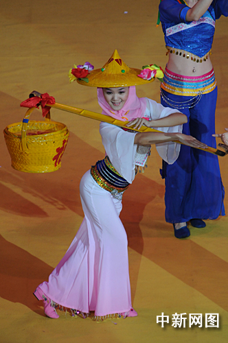圖為福建“惠安女”挑著竹籃表演趕送節(jié),以舞蹈表達(dá)心中的喜悅之情。