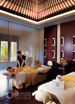 大堂所在地是一座高高在上的宮殿式建筑,檐角高挑,莊重有儀,進來后,一條長長的木廊道直通向光的盡頭,皇家的氣派表露無遺。整個酒店的設計靈感則來自北京頤和園的經典建筑設計,包括斜尖屋頂、深色實木、復雜細致的雕刻和馬賽克鑲嵌裝飾等,精品購物店的外墻讓人熟悉地看到天安門城樓的影子,而名為“雪閣”的雪茄吧看上去就像微縮的天壇。這是亞龍灣面積最大的酒店,空間足夠開闊,除了主體建筑和附屬設施外,33座備有私人管家及獨立泳池的私家別墅散落在亞龍灣幽靜的細白沙灘和紅樹林保護區之間,據說每座別墅都有露天日光浴平臺,還有水天相接的無邊際泳池,這種奢華而私密的家庭度假并不適合一個人來此的我。在去往房間的通道里,一樣能感受得到酒店空間上的奢華:所有的房間都只靠一側,走廊的另一側是通透的玻璃大窗,風景不只屬于陽臺,走路的人也可以看到風景!