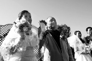 集體婚禮由一家婚戀網主辦,此次共有新人11對,都是通過網絡走到一起的。吳介琴是中央美院退休教授,在新人里年齡最大,愛人蔣曉輝女士58歲,是成都鐵路系統退休員工。