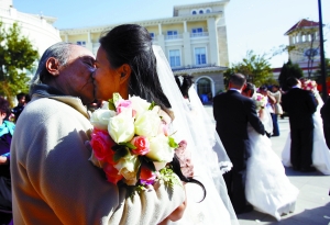 “你愿意做我妻子嗎?”81歲的吳介琴單膝跪地向愛人蔣曉輝求婚時,在場親朋給予3分鐘的掌聲。昨日,與另十對網戀成功的情侶一起,81歲的吳介琴與小自己23歲的蔣曉輝走進結婚殿堂;楹笏麄儗⒃谒拇ㄉ。