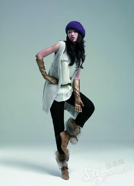 誰說針織衫不能套穿?被細腰帶束住的白色吊帶長上衣搭配黑色七分褲,在柔與剛中取得平衡,再穿上無袖的針織外套,以多層次的搭配方式帶來滿溢的街頭味。若害怕過于單薄,除了可加上外套外,毛皮飾邊的短靴與金色長手套都是能夠填補空白的最佳飾品,與斜帶的紫色毛線帽刻意的撞色,卻在黑白色的服裝映襯下達成共識。