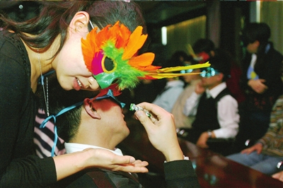 參加者都用眼罩蒙住眼睛,再戴上面具。然后,屋里關(guān)燈,每個(gè)人仔細(xì)甄別異性散發(fā)出來的氣味。如果女士找到屬于自己味道的男士,就可以輕拍他三下,邀請(qǐng)其參加接下來的活動(dòng)。雙方蒙眼參加“心有靈犀”、“危情應(yīng)對(duì)”等一系列的活動(dòng)之后,選定情侶并將定情鎖送給對(duì)方作為信物。