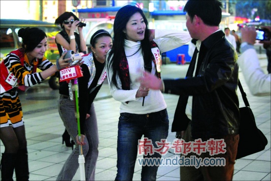由于她們身材高挑、長相標致、穿著性感,很快便吸引了大量圍觀者。起初現場沒有人愿意接受這些行為怪異的女“記者”采訪,采訪受阻后,美女們將目標重新定位,瞄準了過往行人中的帥哥。效果還不錯,其中幾名帥哥抵擋不住“辣妹”的誘惑,非常豪爽地接受了采訪。