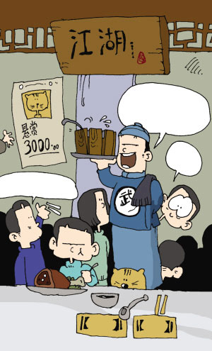 滿嘴“武俠風(fēng)”的“店小二兒”“怪話連篇”,這家飯店沒(méi)有菜單,客人一落座,店小二兒就會(huì)找來(lái)“二掌柜”的“切磋切磋”,也就是幫客人安排飯菜。在店里,用餐是“加點(diǎn)功力”,手中的筷子是“雙截棍”,牙簽是“暗器”,餐巾紙叫做“抹布”,羹匙是“小李飛刀”。除了給餐廳里的餐具、用品起了新名字之外,在與客人對(duì)話時(shí),“店小二兒”嘴里說(shuō)的也沒(méi)幾句“普通話”。上菜時(shí),“店小二兒”高喊:“‘古墓派’添點(diǎn)‘功力’,木桶羊肉——‘九陽(yáng)神功’一份。”客人詢問(wèn)“木桶飯”的價(jià)格,“店小二兒”表示:“一桶五兩碎銀子”。找給客人的零錢(qián),店小二兒稱(chēng)這是“大俠遠(yuǎn)行的盤(pán)纏”。客人臨走時(shí),全店的“小二兒”都會(huì)一起高喊:“青山不改,綠水長(zhǎng)流,后會(huì)有期,恕不遠(yuǎn)送。”