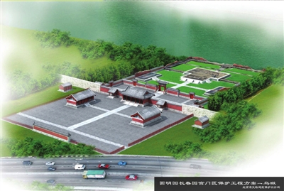 長春園宮門古時(shí)專供皇帝出入,盛時(shí)列序于圓明園大宮門之后,俗稱“二宮門”。昨天,長春園宮門和門前兩個(gè)朝房的主體建筑已完工,建筑外還搭著腳手架。圓明園管理處負(fù)責(zé)人表示,開春將完成最后的油漆彩繪以及地面鋪磚工作,五一將對游人開放。
