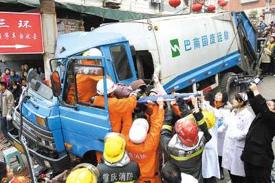 事故后不久,消防官兵和交警先后趕到現(xiàn)場(chǎng)。運(yùn)渣車車頭嚴(yán)重變形,消防員迅速用破拆工具救出了環(huán)衛(wèi)工人張先陽和李國(guó)華,但營(yíng)救最后一個(gè)被卡環(huán)衛(wèi)工尹修正時(shí)遇上困難。尹修正的腿已經(jīng)從變形車門的裂縫中伸出車外,因其全身被卡,消防無法實(shí)施協(xié)助救援,硬拉又怕其難忍疼痛,他們只有一點(diǎn)一點(diǎn)地邊擴(kuò)張、邊移動(dòng),最后又因空間狹窄,只得用起重機(jī)將運(yùn)渣車向后拖移了20厘米,1個(gè)半小時(shí)才將尹修正救出。隨后,他被緊急送往新橋醫(yī)院。據(jù)了解,傷者全都脫離生命危險(xiǎn)。中午12點(diǎn)半,運(yùn)渣車最終被運(yùn)走。此次救援工作耗時(shí)4個(gè)小時(shí)。