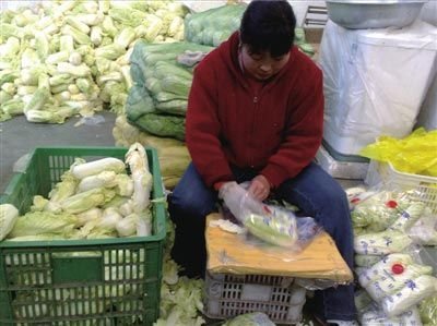 老板說,這些“高山娃娃菜”并非產自云南,而是北京,“說得明白點就是白菜心”。他說,去年冬,他還出售過娃娃菜的包裝袋,讓小商販把那些爛掉的大白菜剝成“娃娃菜”,自行裝袋出售。