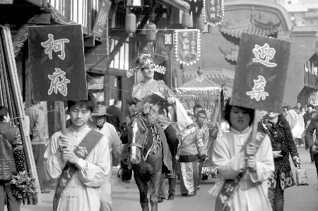 上午9時許,在震天的鑼鼓聲中,33歲的新郎Nicholas(中文名柯家樺)騎著一匹高頭大馬,帶著迎親隊伍由資中鼓樓壩廣場出發,浩浩蕩蕩地前往當地有名的文化古跡文廟。馬背上的新郎羽扇綸巾,而新娘則端坐在花轎中,前有“媒婆”和“丫鬟”帶路?h城少有如此特殊的迎親隊伍,加之新郎是一個膚色白皙的老外,沿途引得不少群眾駐足。