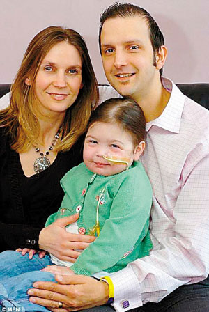 據英國《每日郵報》20日報道,現年5歲的英國女孩杰斯敏·米爾扎日前創造了醫學史上的奇跡,因為她先后移植了爸爸的肝和媽媽的腎,成為英國第一例由父母共捐器官救活的孩子。目前,小杰斯敏恢復良好,已經重返學校了。