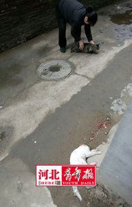 從23日晚上開始,陸續有石市范東宿舍的居民被橫在一棟單元樓門口的貓尸嚇住,墊著報紙的貓頭不久也被人們發現。驚恐之余,居民們群情激憤,“殺貓兇手”也引發人們的種種猜想。