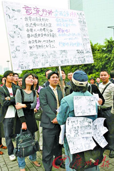 漫畫家名為黃達沖,在天河體育中心南門廣場舉著一面與他身高差不多的鐵牌,上面展示了他的“三國英雄前傳”漫畫以及他的宣言:“盲流行動·賣稿賣身一千萬……”他一身牛仔套裝上前身后背也貼著多張漫畫作品,引得路人圍觀。何謂“盲流”?他解釋道,他是南寧人,來廣州十年,做過出版和媒體工作,現(xiàn)在快40歲了,還沒找到方向,所以認為自己是盲流。“我去年11月開始創(chuàng)作‘三國英雄前傳’,現(xiàn)在完成了一半,今天來到這里想找人投資。如果有誠意的話,私下談價錢……一千萬嘛,不一定是人民幣。”在旁邊還有一位長發(fā)壯漢,是黃達沖的“哥們”,也是一位“自由藝術(shù)家”,正幫著他派傳單。
